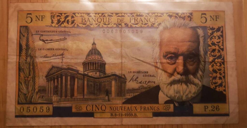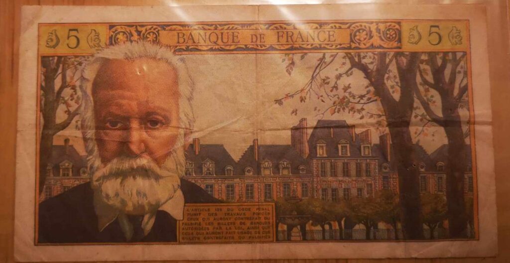I had heard of Victor Hugo through my own coin and banknote collection. This coin and note are from my own collection, and are French Francs. ‘Note’ that the signature is the same as the letter 😉