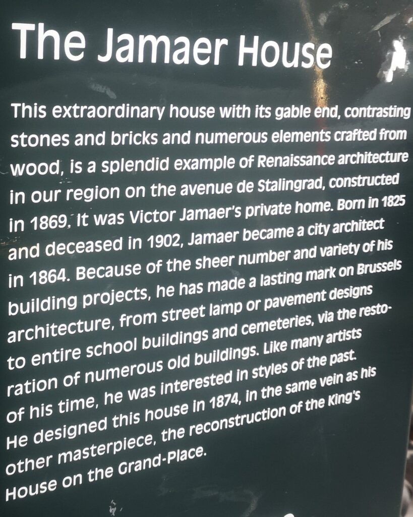 Tantalising titbit: We actually saw Victor Jamaer’s private house which he’d built in 1874. It was close to our hotel and was very pretty. Indeed, it caught my eye in the street with its interesting style, compared to the others around it. Not exactly what I’d call one of Brussels’ highlights, but an interesting spot of history nonetheless.