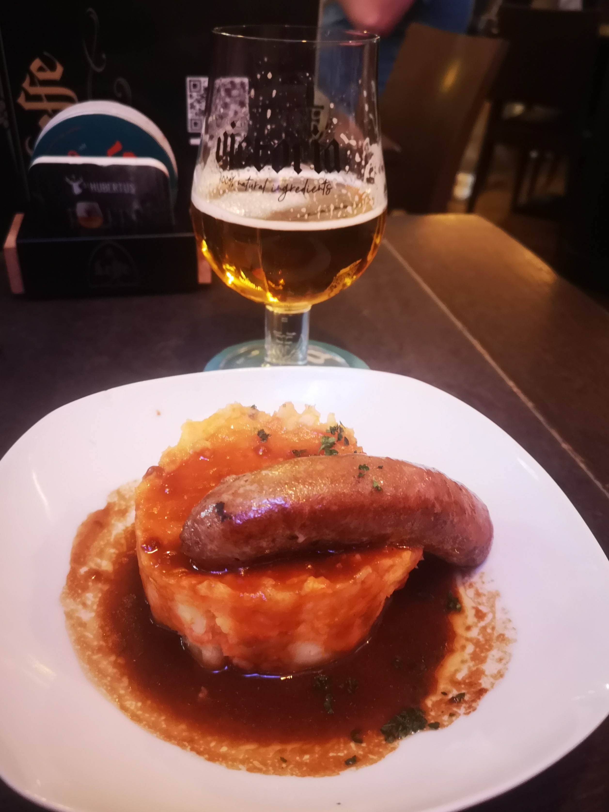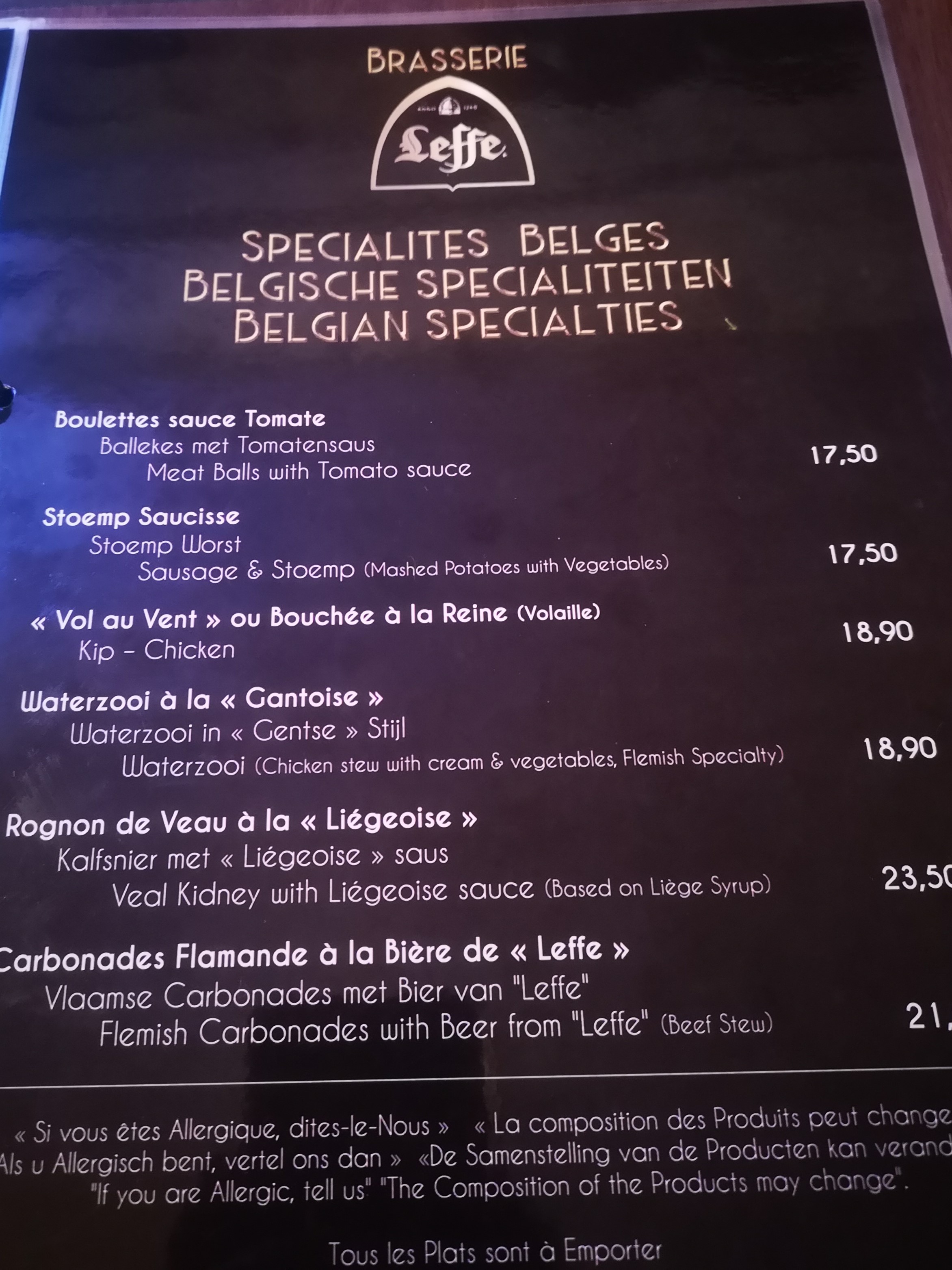 I ordered the Belgian equivalent of bangers and mash (sausages, mashed potatoes and gravy). The sausage was very meaty, although to look at it, it was quite a sad looking flaccid member either exhausted or feeling very sorry for itself. The mashed potato was very lumpy to the point I was unsure you could call it ‘mashed’… maybe ‘dropped’? It was warm although not hot. The dish was okay, but overall, I did not think it worth the 17,50€ price tag. In reality though, from what we saw of Brussels prices, this was fairly standard. Check out the Belgian Speciality menu, as well as the beer menu, both draught and bottles. The prices are on the right.