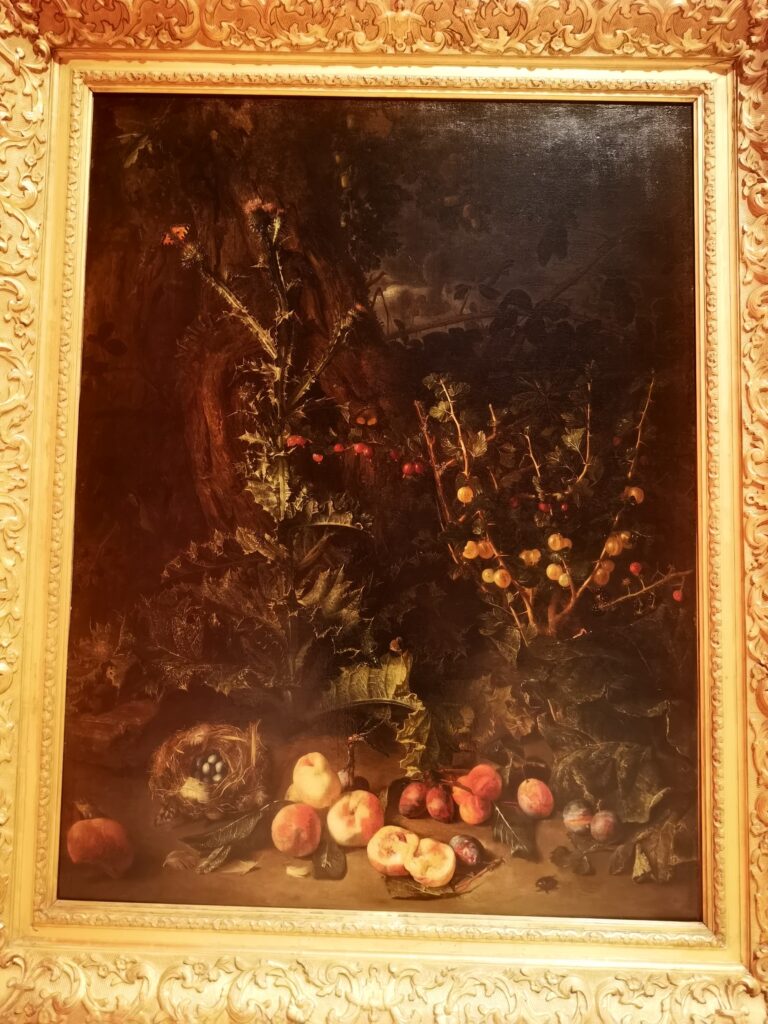 As for the mystery painting, I love the detail on the thistle. The spikes are so realistic, I fear just touching the painting or frame with prick your finger. The surrounding tender fruit and the butterfly delicately brushing the thistle flower offer a softer alternative to the harsh and jaggy leaves and thorns. They seem to make the spiky plant feel welcome, like it’s part of their group and they accept it, regardless of spikes. They know to be careful; but they also that they’re not in danger. Or something like that.