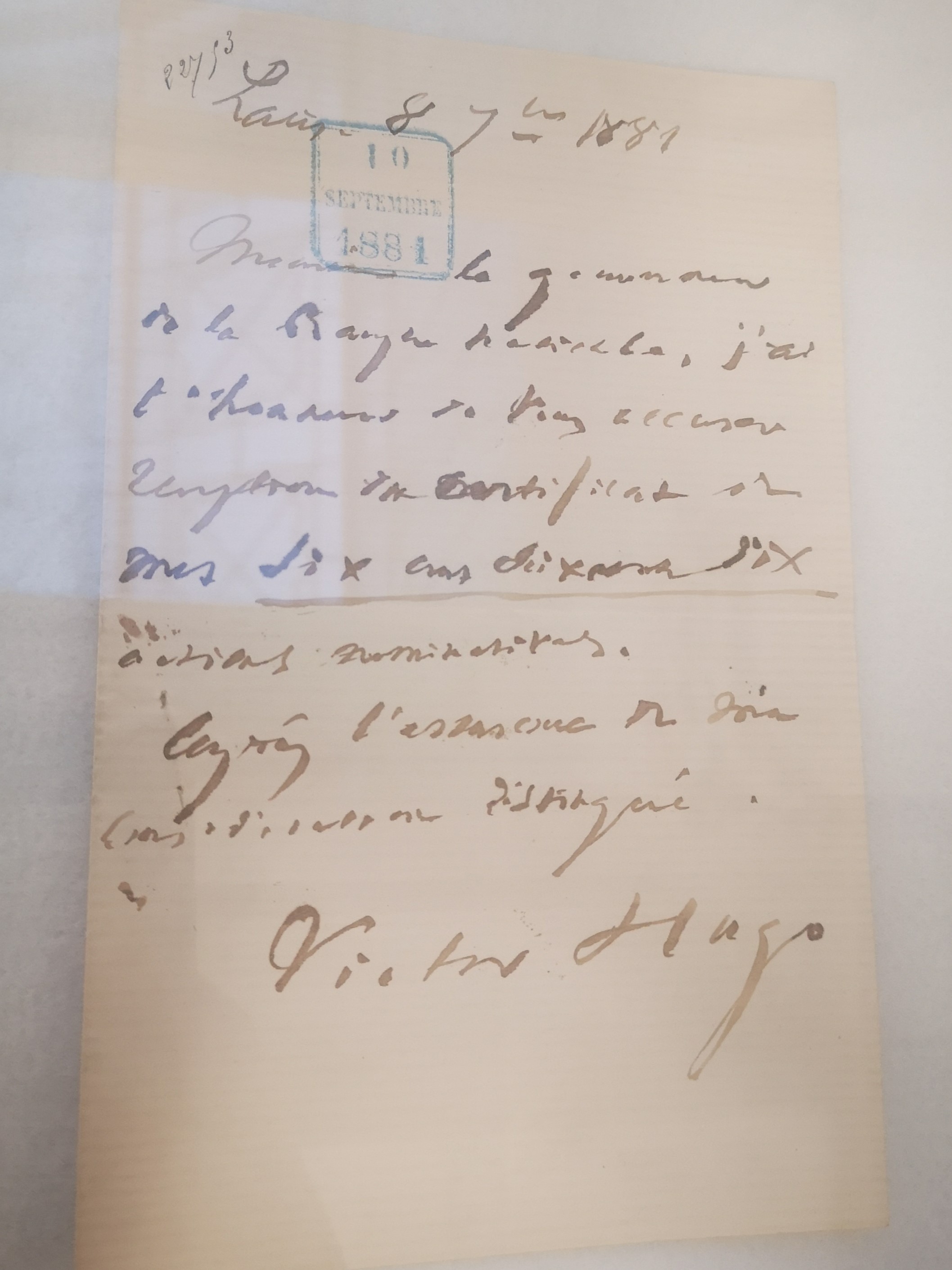 Something I did learn was that Victor Hugo owned bank shares in the Bank of Belgium. He gave some to his mistress, who then gave them back to him at a later date. The bank wrote to him to confirm transfer of ownership of these shares, to which Victor Hugo wrote a confirmation in response. You can learn more about the Bank of Belgium shares, click here.