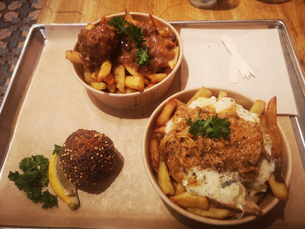Short and black, it clearly wasn’t mine, but as it was on top and not inside the food, I manned up and just removed the hair and ate my meal. I told them after, so they can safeguard against future issues as there was a staff member matching the hair who was not wearing any head cover. All in all, my food cost 9,50€ for the loaded fries, 5,50€ for the croquette and 4€ for the beer (half pint).