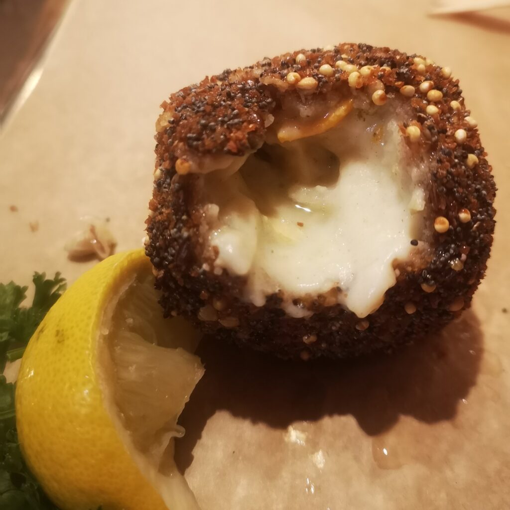 Poutine Bxl topped chips with some thin vegetables, cheese and what we suspect was pulled pork. As a side, I got a croquette moueles and crème (a mussels and cream croquette). It was rather a creamy croquette and made for messy eating. Not bad but probably wouldn’t order again.