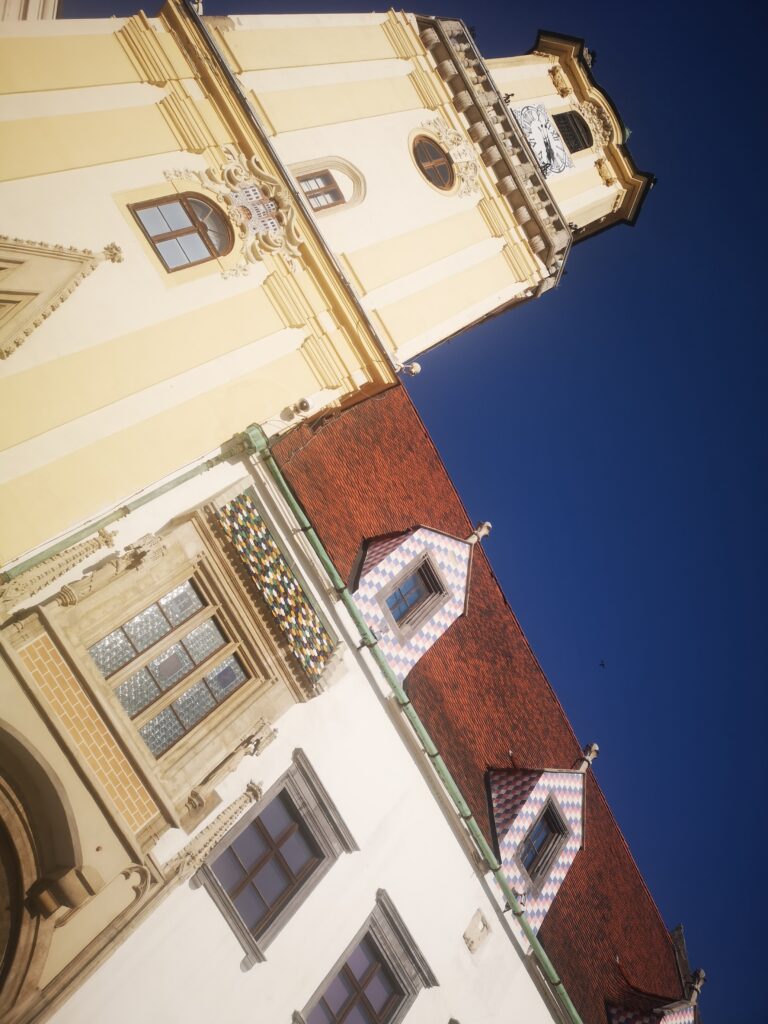 Originally just one town house with a tower, it turned into the town hall in the early 15th century. It then started assimilating further houses into its complex until a redesign in the mid-16th century unified all the buildings’ façades. The Baroque-style appearance of the tower was the result of a 1733 modification and since then, further modifications and changes have been made. Today it stands proudly: yellow and white. Compared to the Zagreb church, the mosaic rooving over the window was nothing. And yet, its quirkiness was still pretty and eye-catching, along with the colourful façades surrounding the upper windows.