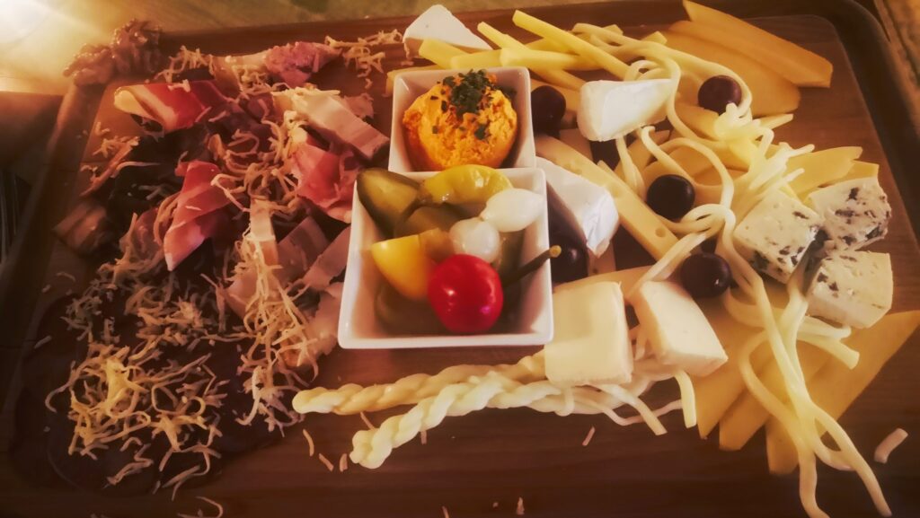 Hamburg bacon, Wurzel bacon, homemade sausage, smoked beef tongue, smoked cheese “parenica”, smoked string cheese, beer cheese, sheep cheese, Emmental, Berg Cheese, picked vegetables and homemade bread (this last not pictured)