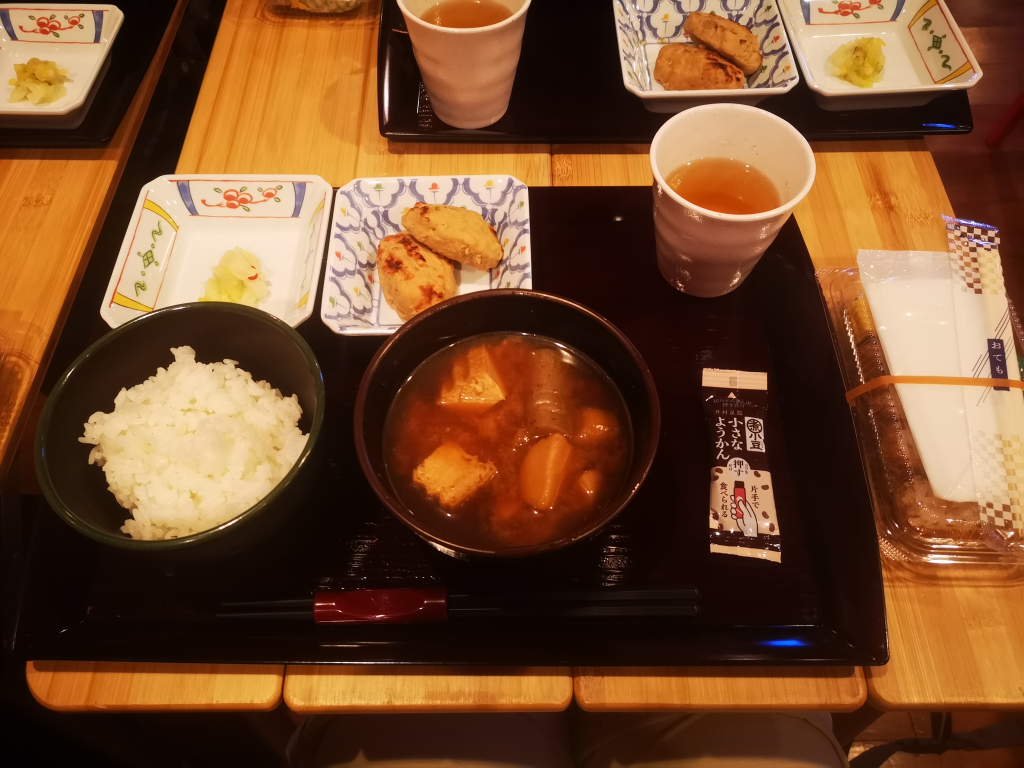 The dining and common space was a large wooden hall, with school desk-like tables set out for eating. You are assigned a specific dining time, a specific table (shared with others) and the food is handed out on trays. There is no choice; you get what you’re given. You can have extra servings of rice and miso soup, if you wanted.