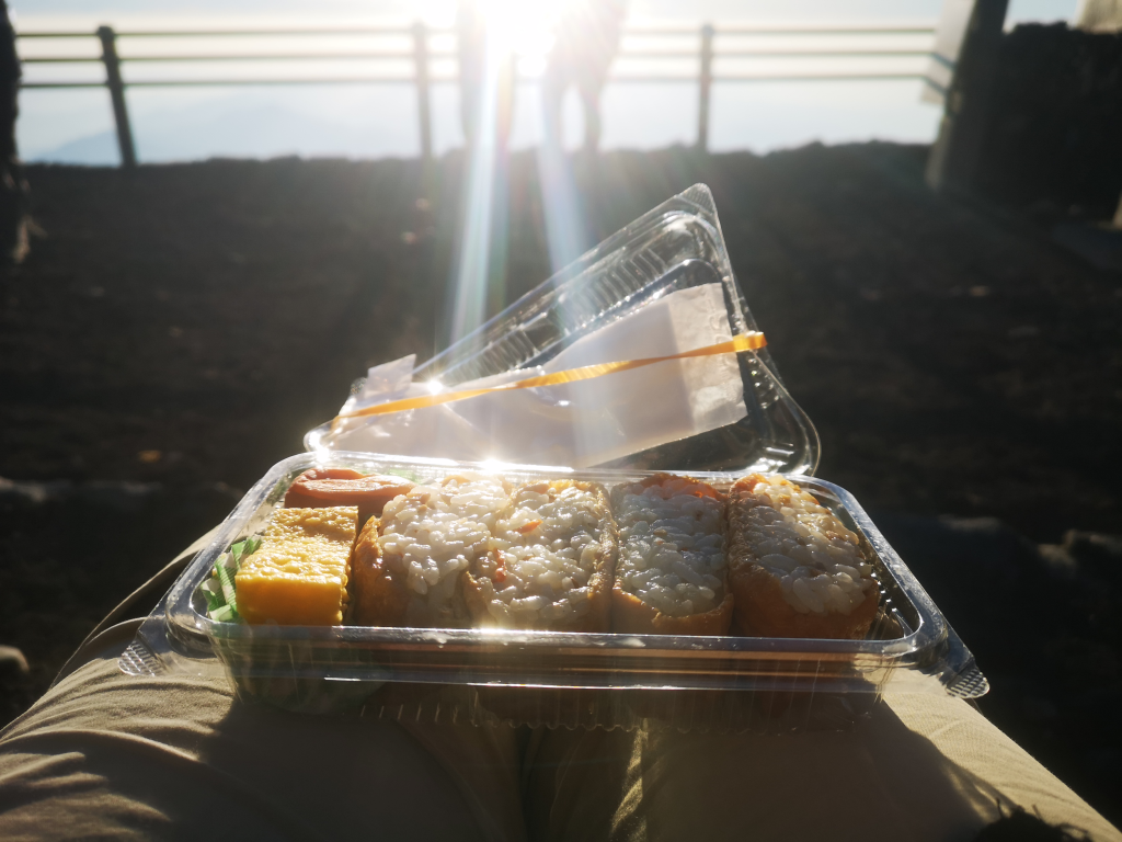 I wish I could tell you what we ate, except rice, but I have no idea and didn’t really want to ask. Breakfast was given to us in plastic boxes for climbing Mount Fuji’s top half in the morning/middle of the night. Rice wraps, omelette and a vile disgusting vinegar squishy thing. Yuck.